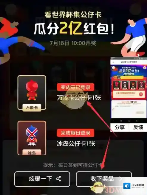 点击后弹出每日登录优酷得世界杯公仔卡,此时有可能获得万能卡,如下图所示。