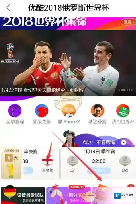 点击后支付宝自动打开优酷2018世界杯界面,此时直接点击下面的集卡分2亿,清空购物车图标,如下图所示。
