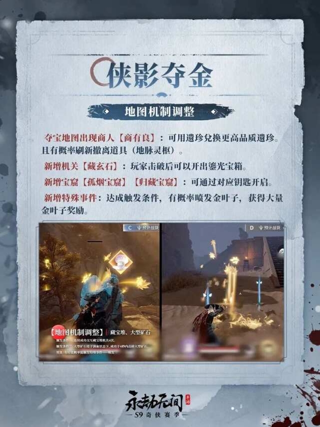 夺宝地图出现商人商有良、新增机关藏玄石、新增宝窟孤烟宝窟归藏宝窟、新增特殊事件,获得大量金叶子奖励。