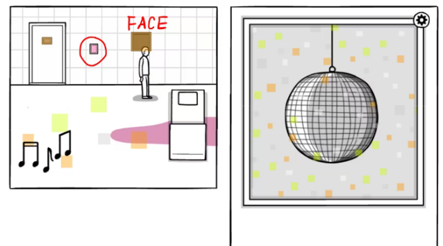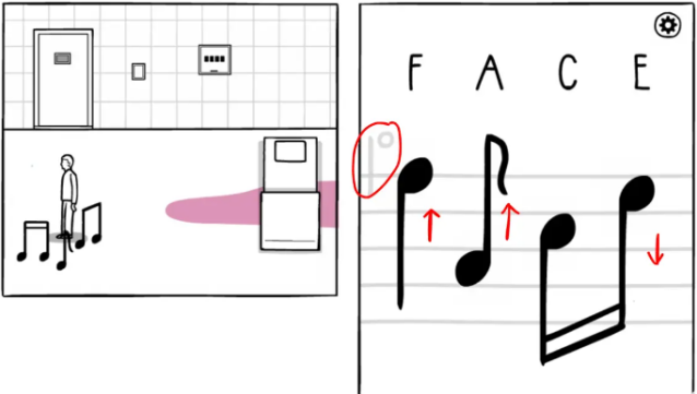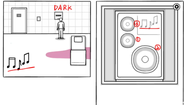 走到密码箱输入密码[DARK]。出现音箱,先按中间的喇叭,音符在房间左下角移动速度变慢的时候再点击一次,会让它停在那里;再同样的方法依次点击下面和上面的喇叭,让它们按照音箱上面的标识排列并停在房间左下角。