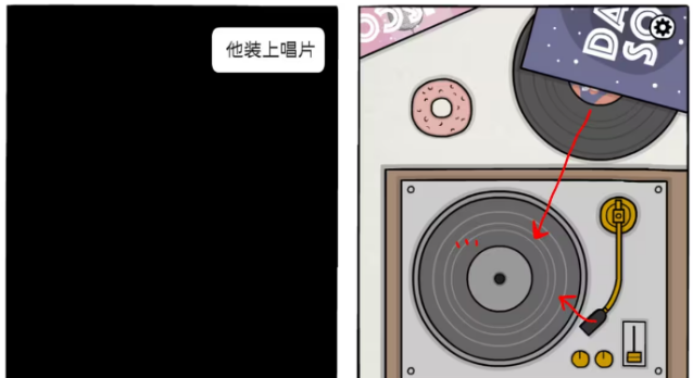 把唱片向下移到唱片机上,把唱针移上去,长按转动唱片。