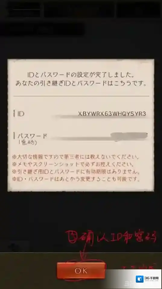 第四步:输入密码。上面的ID是引继码号,下面需要玩家手动输入的则为密码。输入完成后点击OK即可。