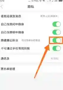 4、将〖隐私〗里〖隐藏最近听众〗右侧的开关打开即可。