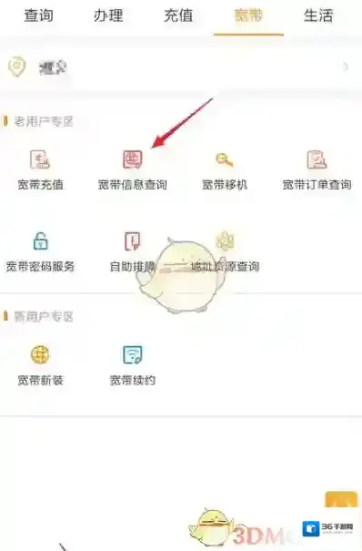 5、如果对自己的宽带费用有疑问,可以点击查询办理菜单下的宽带信息查询。