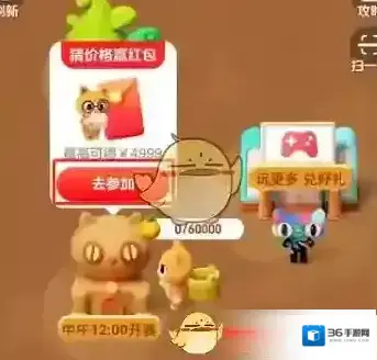 进入喵果活动页面后,控制猫猫拖动到如图位置,跳出猜价格赢红包的弹窗,点击去参加即可。