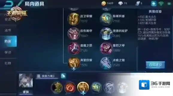 这套出装适用于双人路~装备合成平滑,奔狼纹章功能性强,能提高队友的作战能力,其他出装则以肉装为主。虽然输出能力较弱,但是团队作用非常好,生存能力也很强~