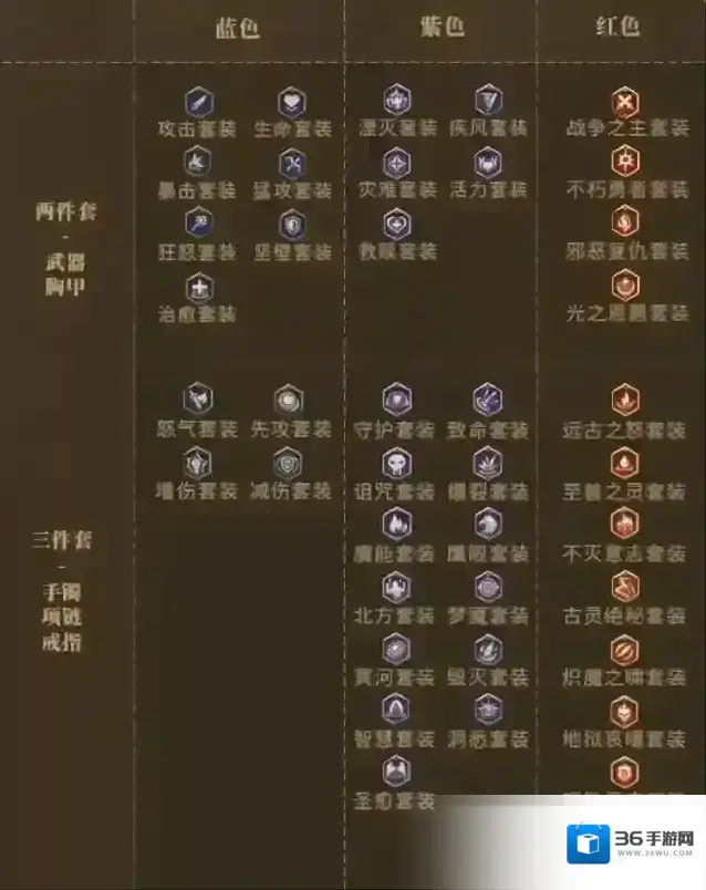 装备的套装分为三个等阶,按底色划分为蓝色、紫色红色。装备副本层数越高,掉落的套装等阶越高,套装效果越强力。