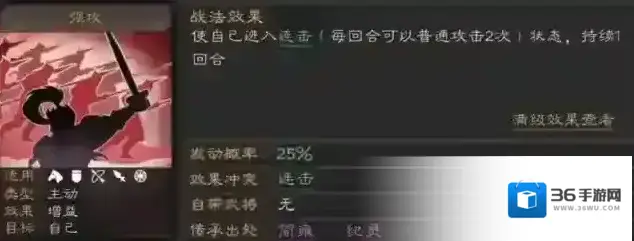 强攻是由简雍、纪灵传承而来,可以使自己进入连击状态持续1回合。在获得连击状态后便能发挥双倍的群攻效果。