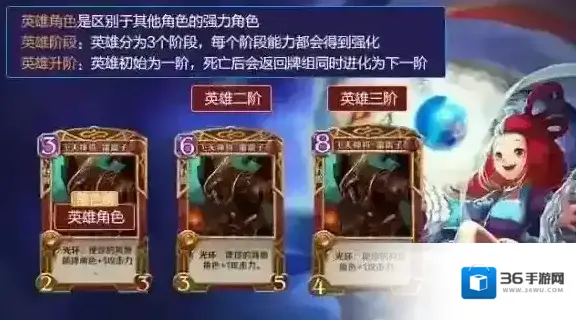 谈到左右战局的能力,不得不提角色牌中的英雄角色,它们是区别其他角色的强力卡牌,分为不同阶段并具备升阶能力,每个阶段能力都会得到强化。