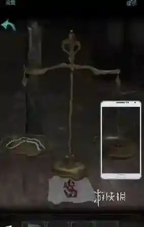 10、将首饰放在天秆上,点击用手机照一下首饰,得到铜钱。