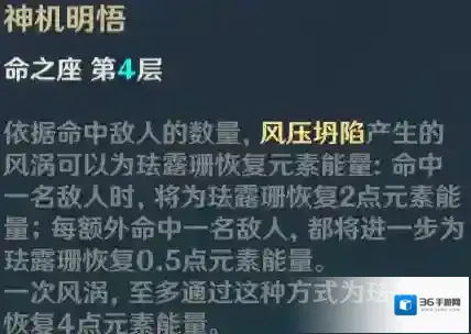6命:这个命座非常实用性,一个是持续性的聚怪和暴击伤害加成。而且可以触发「风压坍陷」和4命效果,即18秒大招可以触发6次,加珐露珊的2次蓄力,即一共8*4=32能量回复,当然实际战斗不一定有这么多敌人,但无疑改善珐露珊充能问题。