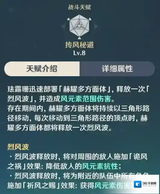 开启大招会在空中产生一个能维持12秒的多面体「赫耀多方面体」,同时对周围造成风元素范围攻击,且立即对周围释放「烈风波」(要特别注意这个是没有伤害哦!!!不能触发风套哇!!!),之后「赫耀多方面体」会按等边三角形的轨迹2s移动一次,即前后一共触发6次「烈风波」。