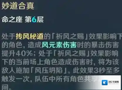 这里需要注意大招的「烈风波」释放时,就可以降低周围敌人的“风元素抗性”并提高队伍“风元素伤害”,即「诡风之祸」和「祈风之赐」。而且「烈风波」释放时是没有伤害的,6命状态下可以持续性触发「诡风之祸」。