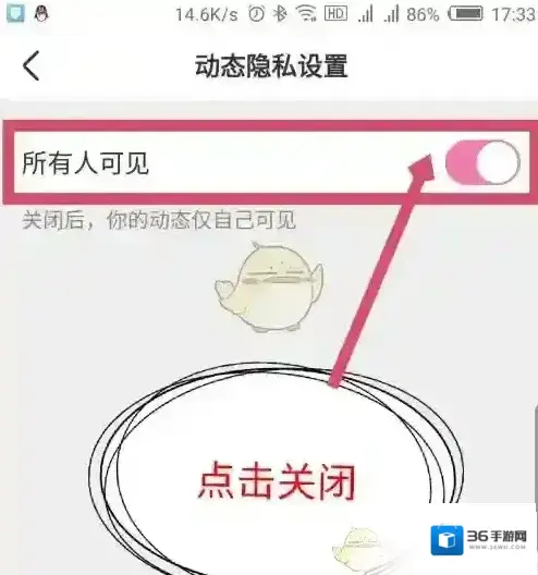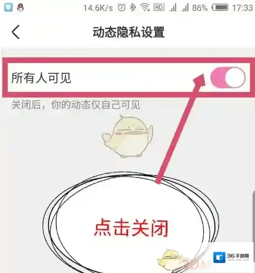 5、在打开的动态隐私设置界面,默认的是所有人可见,点击后面的滑块关闭,关闭后仅自己可见。如图所示