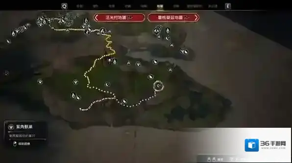 紫角兽巢穴的位置,但我白天晚上都去晃了几次,都没发现紫角兽,不知道是不是要推主线或支线才会出现。
