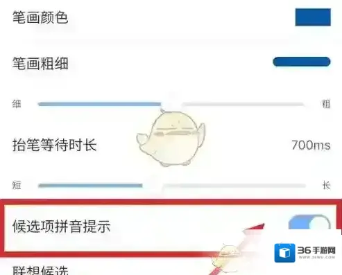 5、找到“候选项拼音提示”,点击打开开关,设置完成。