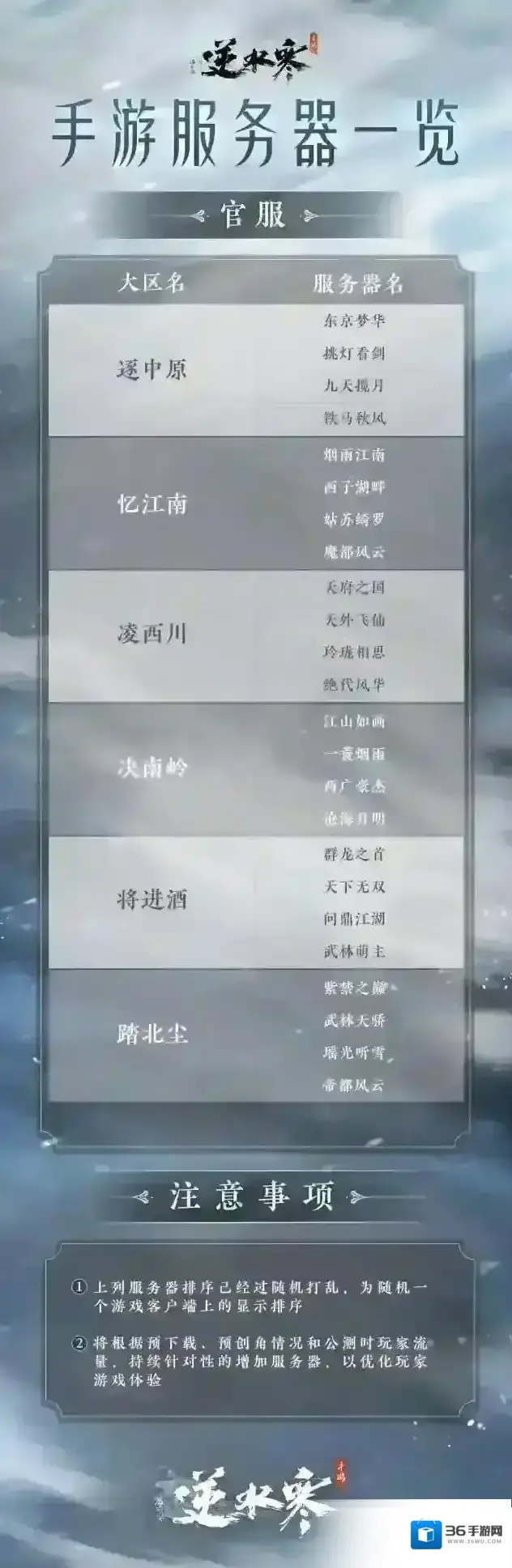 6月27日,预下载开启后,我们将首先推出31个服务器供玩家提前创建角色。它们由24个官方服务器和7个渠道服务器组成。注意1:下图的服务器排序已经过随机排序,为随机一个游戏客户端上的显示排序结果。注意2:我们会根据预下载预创角情况和公测时的玩家流量,持续针对性的增加服务器,以优化大家的游戏体验。官服为: