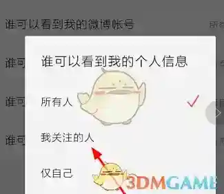 7、进入个人主页展示设置的界面,在谁可以看到我的个人信息,可以选择所有人、我关注的人或者仅自己,如图所示