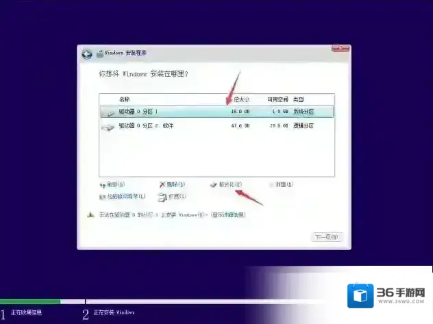 5、如果已经有磁盘分区了,我们选择C盘,然后格式化一下(如果未分区的硬盘可以按引导进行分区)