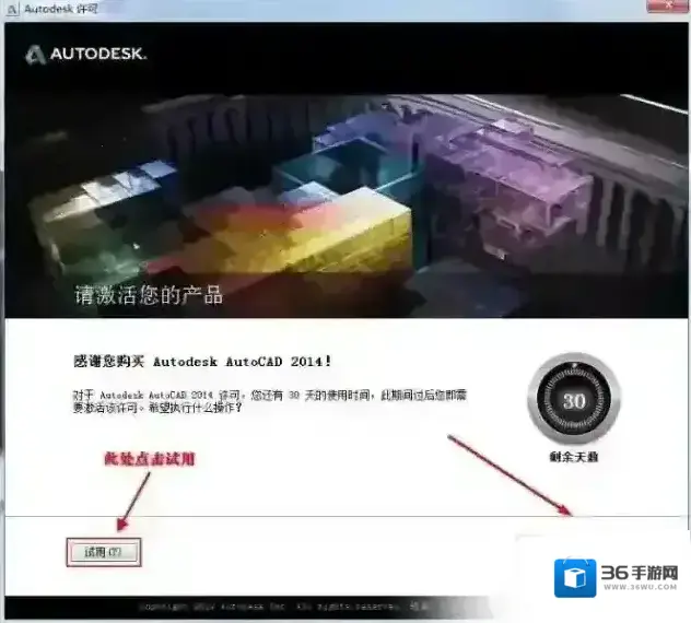 4、直接安装完成,我们再运行桌面上的CAD2014.打开之后,大家可以试用30天,也可以进行激活。