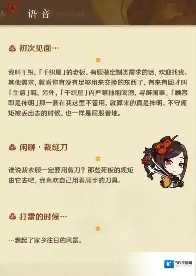 旅行者好呀!今天为大家介绍的角色是千织,她是「千织屋」的老板。枫丹著名服装设计师。