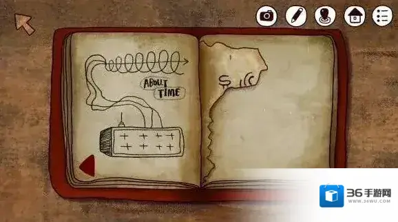 再往下翻就是时间机器的主人写下的文字笔记,翻到最后一页,我们能在左侧画着时间机器启动器的一页上看到一句“About Time”。
