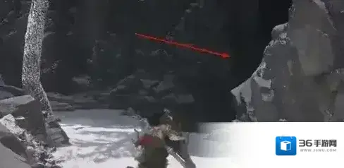3、接着面对篝火往右侧山崖下方看,可以在此处看到山崖之间横着一根石柱