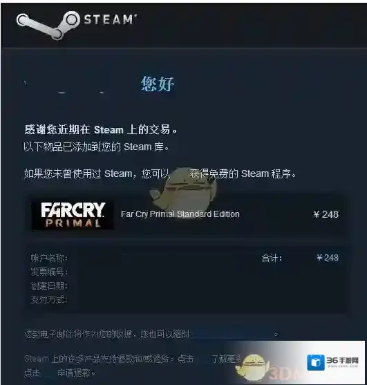 7、购买成功后Steam就会发一封邮件到你Steam的绑定邮箱上,告诉你谢谢购买。
