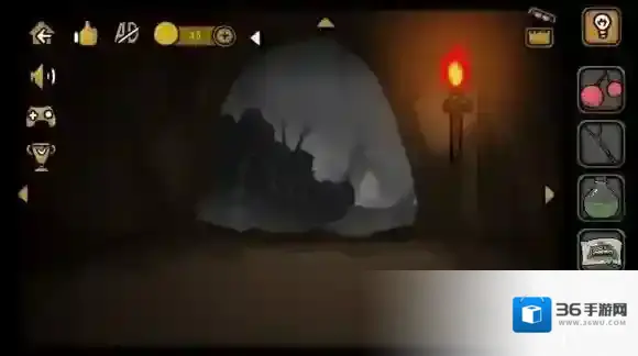 获得道具之后,我们就可以出门了,回到那个黑漆漆的山洞,进入山洞后,向右换场景点击2次来到出口,右边上有一个支架,我们就用木棍和抹布做成一个火把棍。