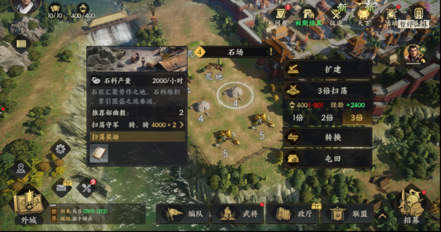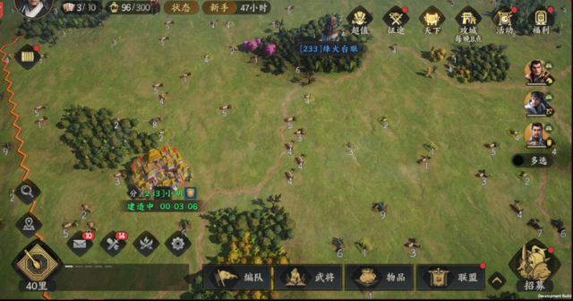 •开启军事府前(主城8级解锁),不打粮草地,林场和石场资源地数量五五开,开启军事府后,可适当提高铜币产量。