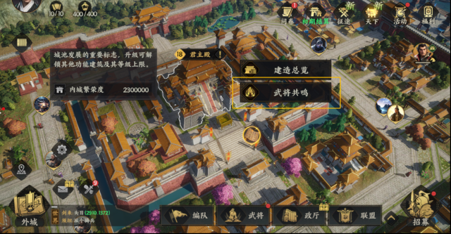 Ø军事府(主城8级解锁):提升带兵上限,为前期开荒重点升级建筑之一。