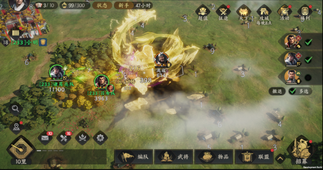 游戏中,只有成功占领资源地会固定消耗30点体力(游戏中其他行为不消耗体力),占领失败则不消耗体力。同时,九州具有PVE无重伤设定,也就是说,即便不小心“翻车”,也不用担心武将恢复时间过长,拖慢打地节奏。