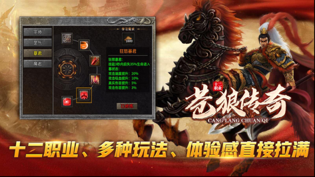 苍狼传奇,180微复古三职业版本,在经典的战、法、道的职业基础上,拓展出特色的十二大流派,并且每个职业各有其优势,搭配上特色的技能能够玩出独特的流派,无论哪一个职业都能一路畅玩到底!经典的地图和玩法内容可以带你回味老传奇的韵味,特色的创新玩法也能让玩家们享受别具一格的激情体验!