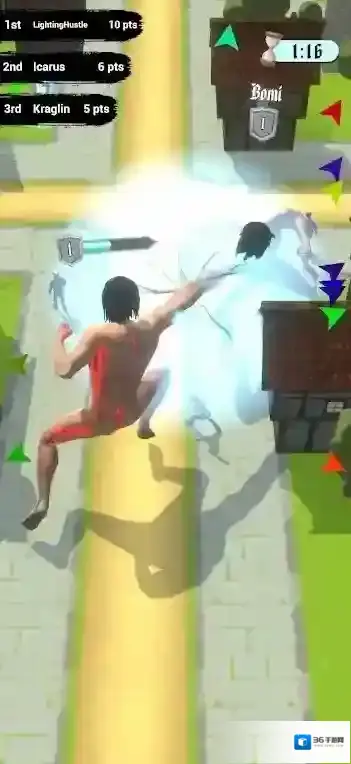 1、画面中有角色在施展技能攻击,左上角显示排名和得分信息,右上角显示倒计时“1:16”,场景中有建筑和一些标识。