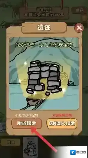 3、通过遗迹交互面板选取周边勘察指令,支付相应物资后开启寻宝概率事件。